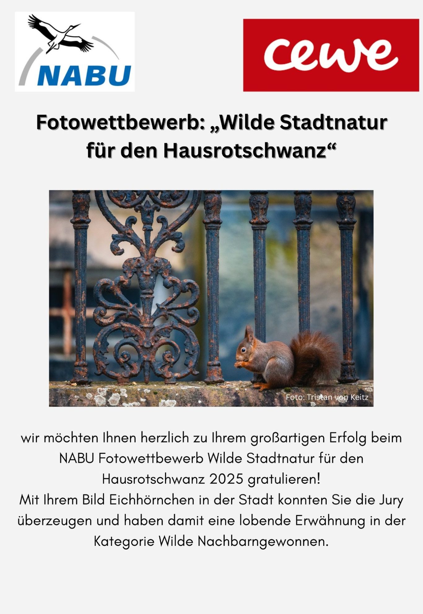 Ich freue mich riesig, dass ich beim NABU/CEWE Fotowettbewerb Wilde Stadtnatur 2025 mit meinem Foto „Eichhörnchen in der Stadt“ eine lobende Erwähnung in der Kategorie Wilde Nachbarn erhalten habe! Es ist faszinierend, wie viel Leben und kleine Wunder sich selbst in unserer direkten Umgebung entdecken lassen – man muss nur genau hinschauen. Dieses Bild steht für mich für die besondere Nähe zwischen Stadt und Natur, die oft übersehen wird. Danke an NABU und CEWE für diese Anerkennung und für den Wettbewerb, der zeigt, wie wertvoll und schützenswert unsere tierischen Mitbewohner sind.